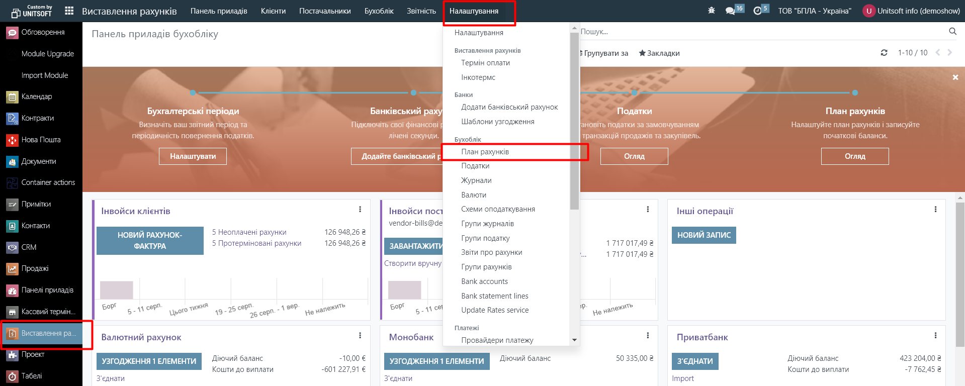 Для цього переходимо в модуль «Виставлення рахунків» - «Налаштування» - «План рахунків»: