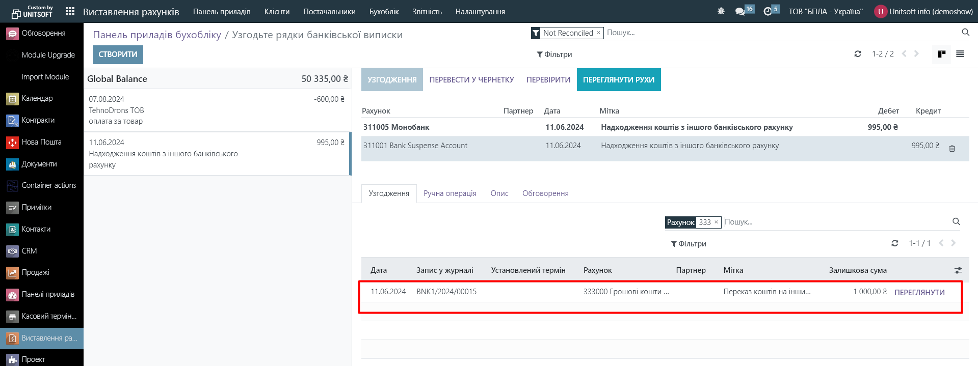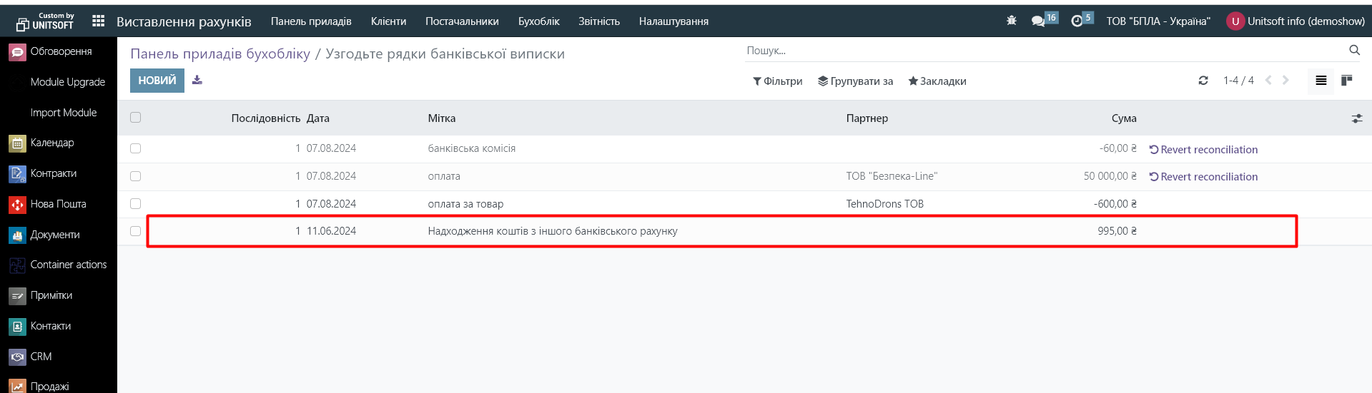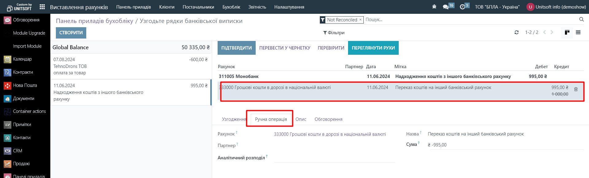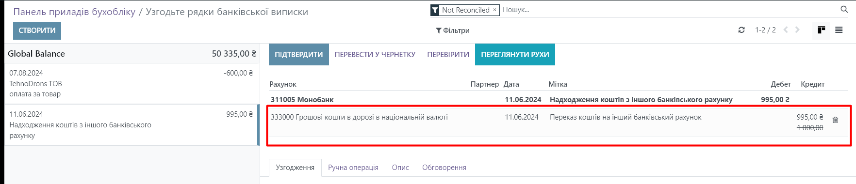 3. Проводимо надходження коштів на інший банківський рахунок (у нас 995 грн, 5 грн списалося на сплату банківської комісії).