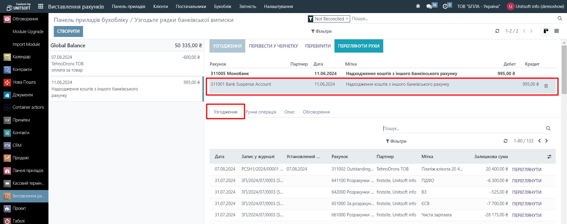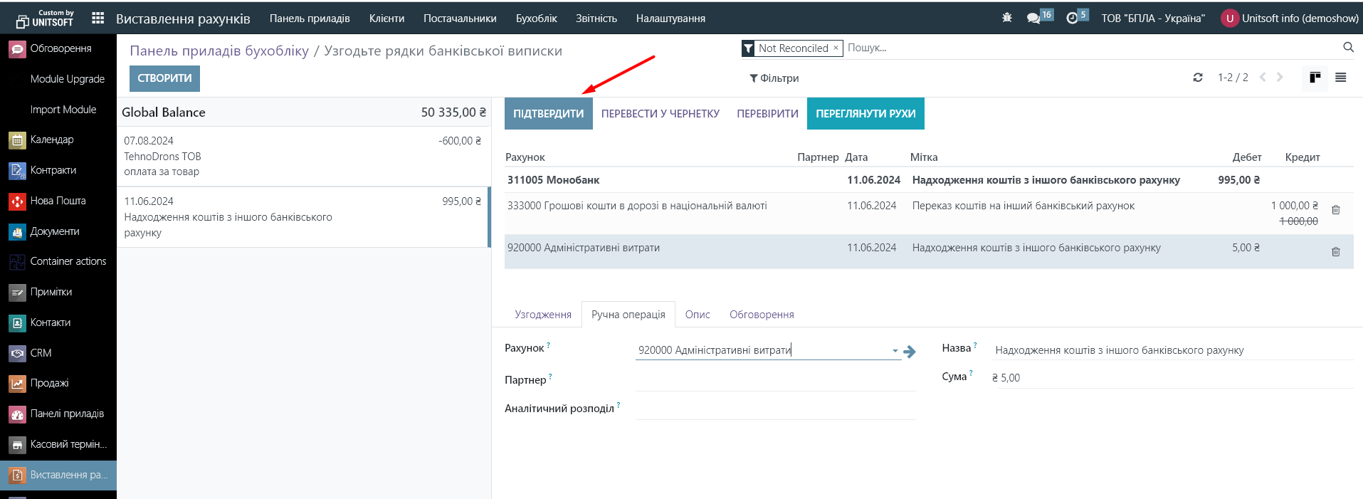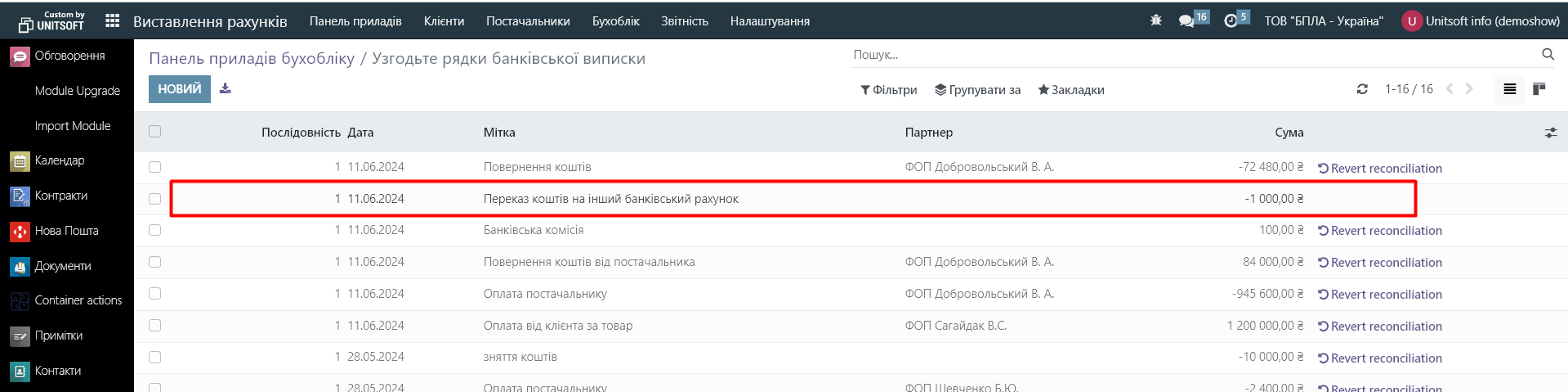 3. Проводимо надходження коштів на інший банківський рахунок (у нас 995 грн, 5 грн списалося на сплату банківської комісії).