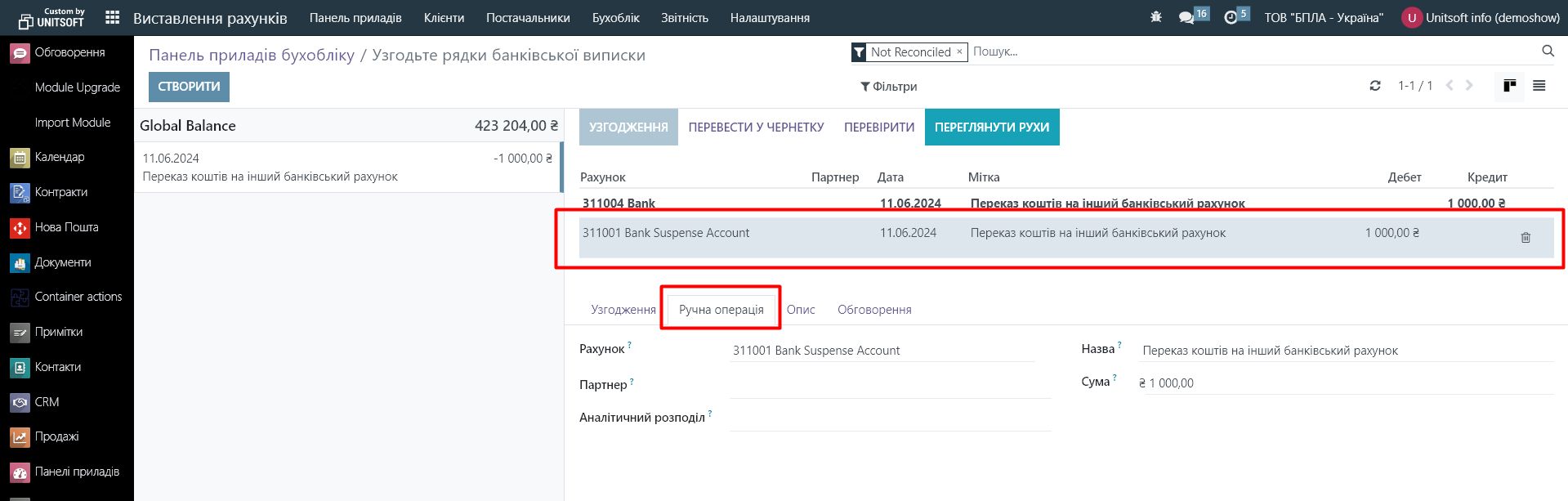 Для цього знову клікаємо на кореспондуючий рахунок, переходимо у вкладку «Ручна операція»: