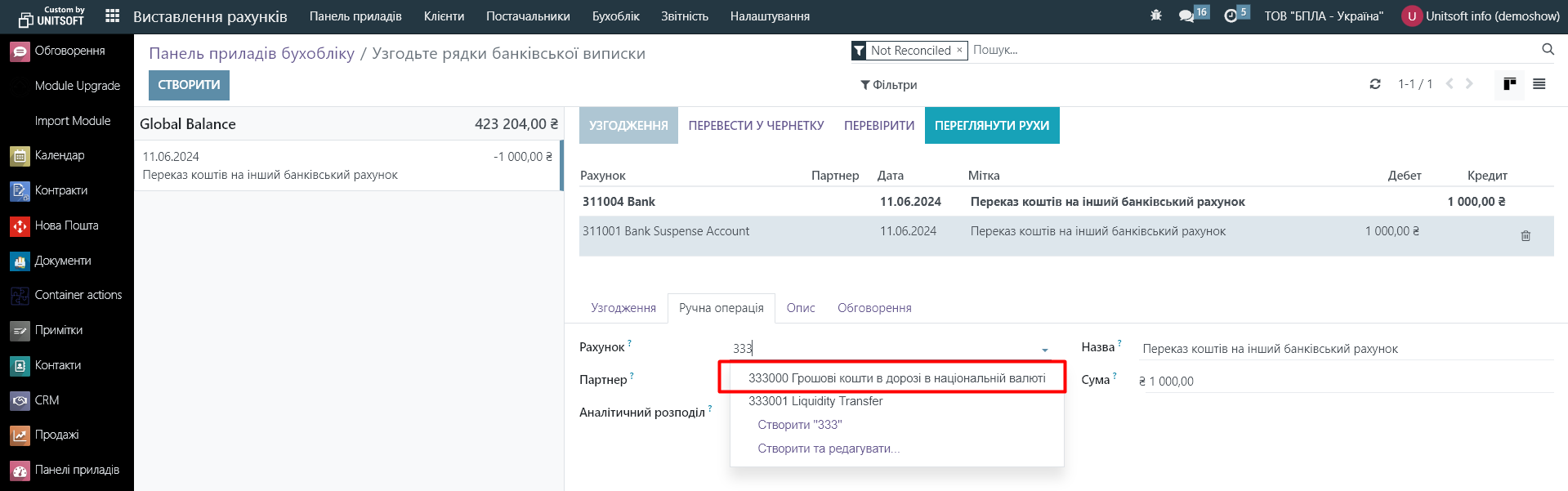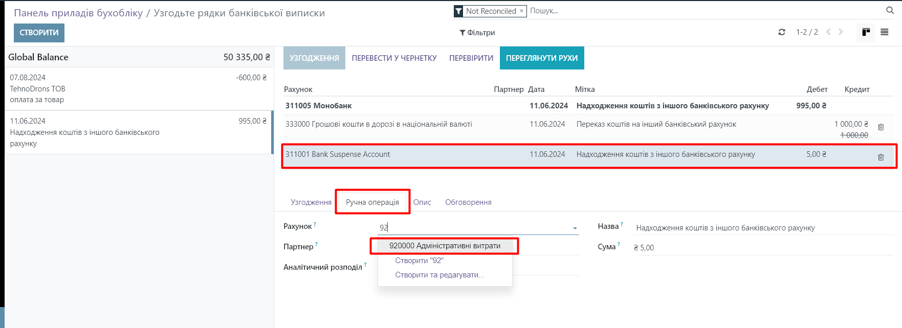 Як бачимо, у автоматично змінився рахунок у вікні узгодження з 311001 на 333000. І ми зараз узгодили лише 995 грн з 1000 списаних. Потрібно ще відобразити 5 грн – банківську комісію і списати її на витрати:
