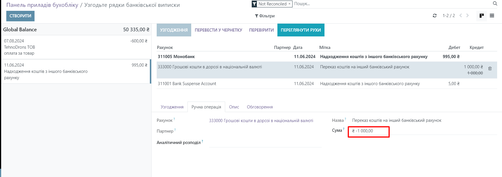 Змінюємо суму на повну (-1000 грн замість -995 грн):