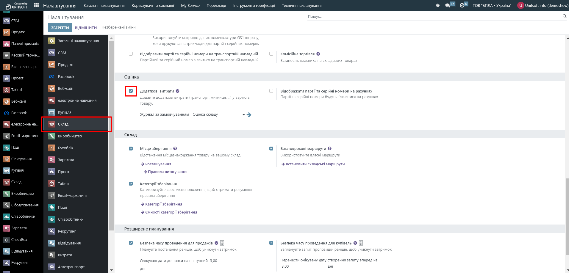 1. Спершу вмикаємо облік додаткових витрат в налаштуваннях. Для цього переходимо в модуль «Налаштування» - «Склад». Ставимо відмітку в пункті додаткові витрати: