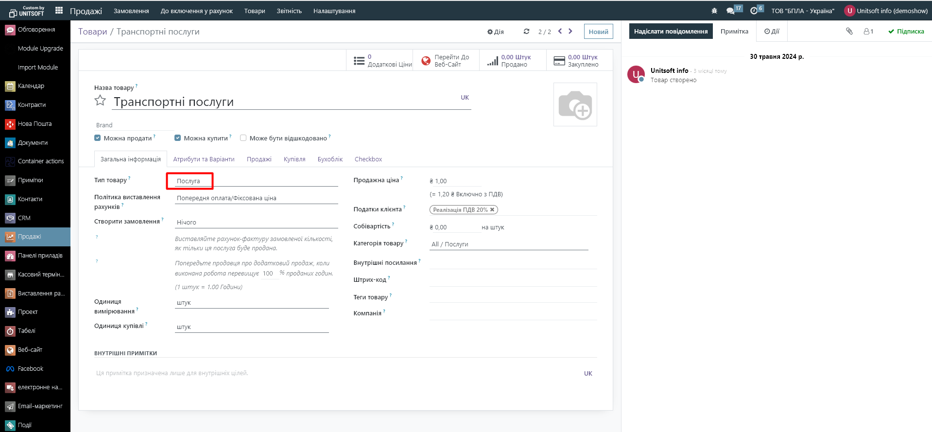 2.1. Спочатку створюємо товар «Транспортні послуги» (якщо у нас його ще немає в базі)