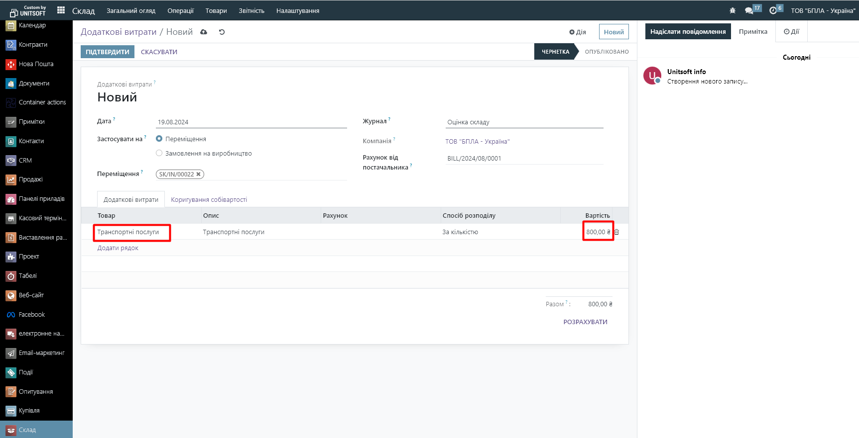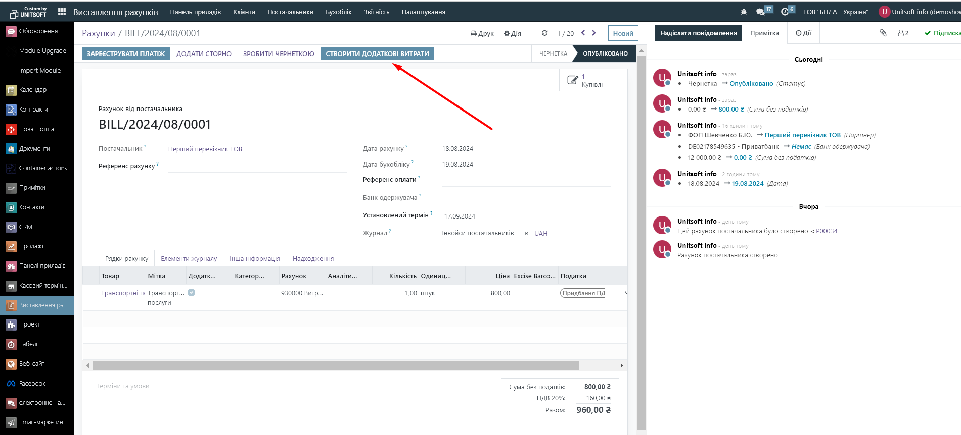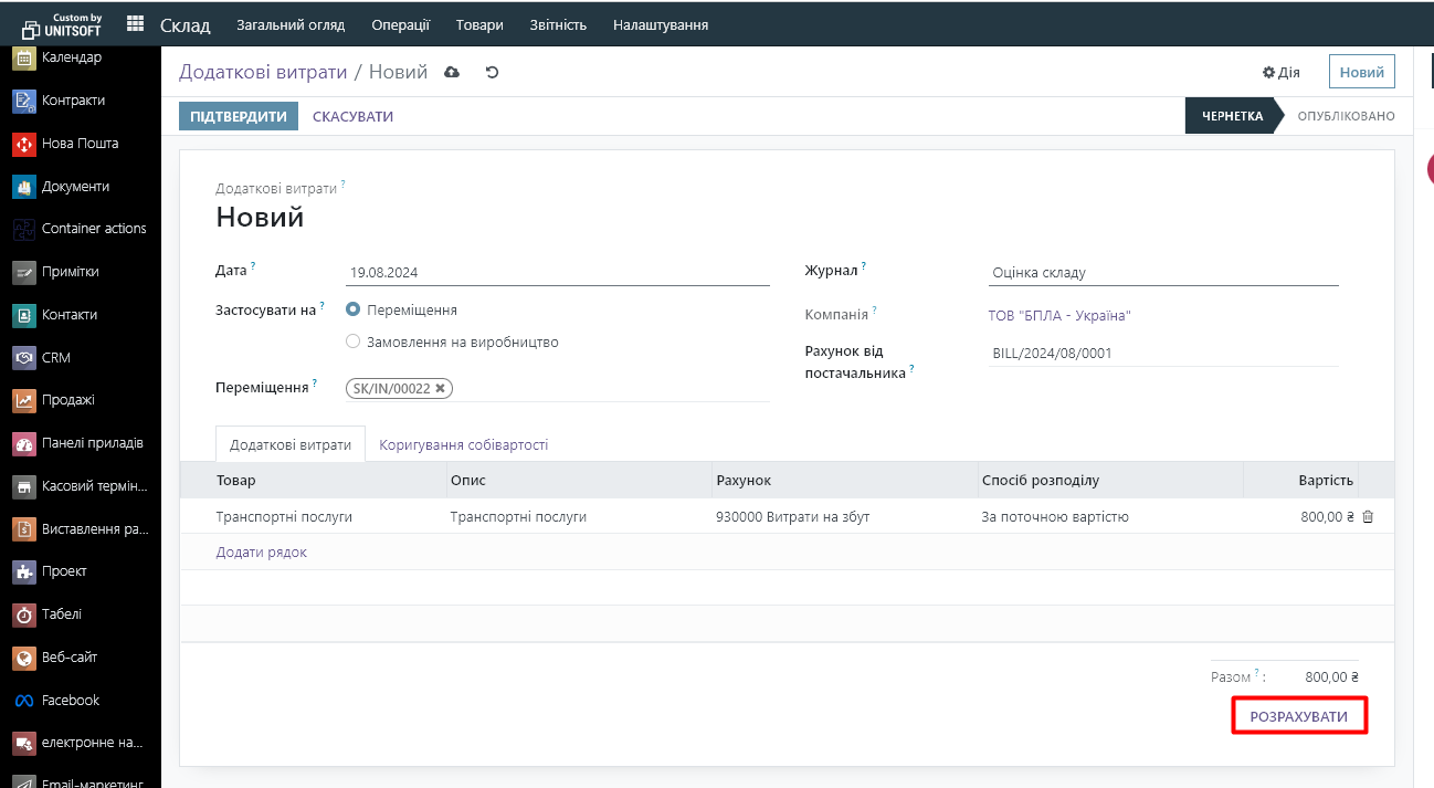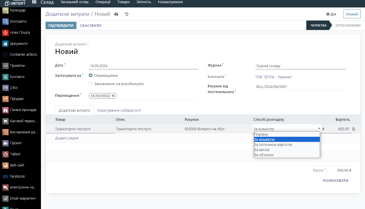 В системі Odoo це можна зробити за допомогою документу «Додаткові витрати».