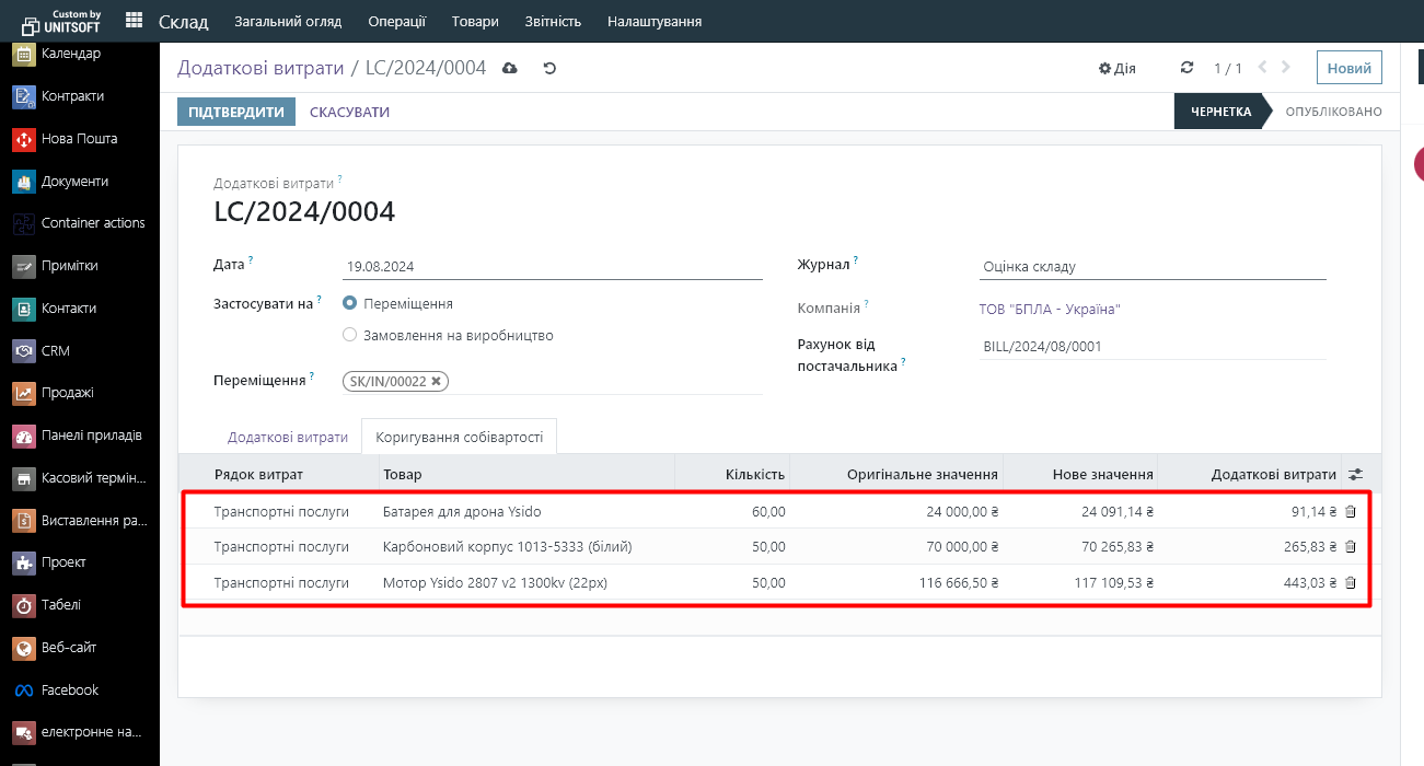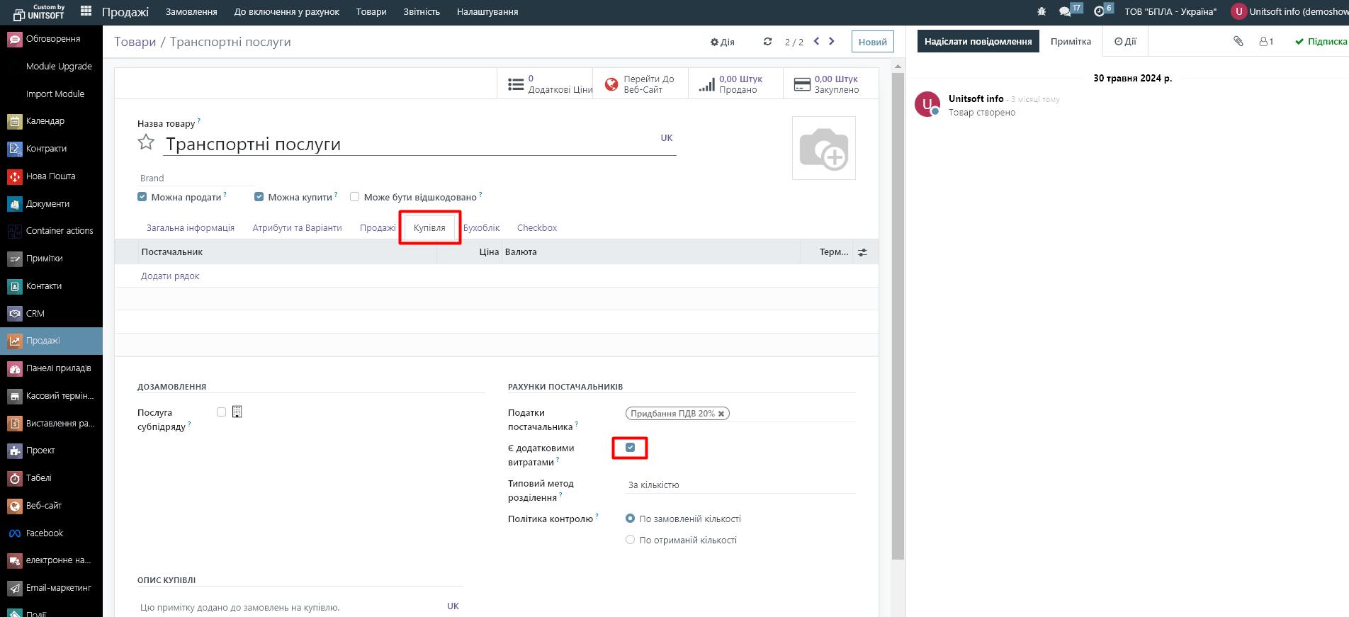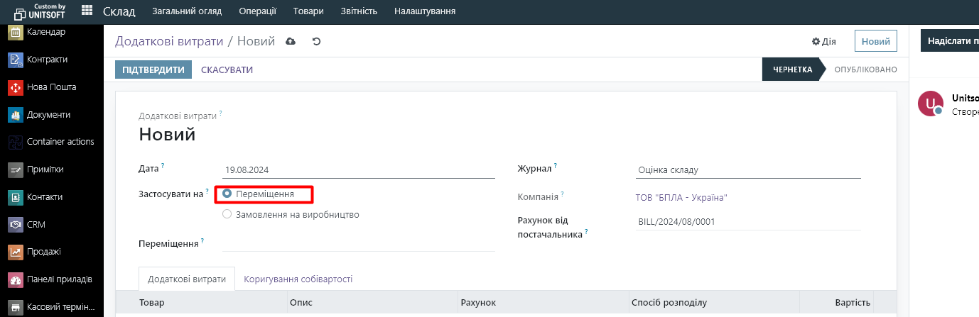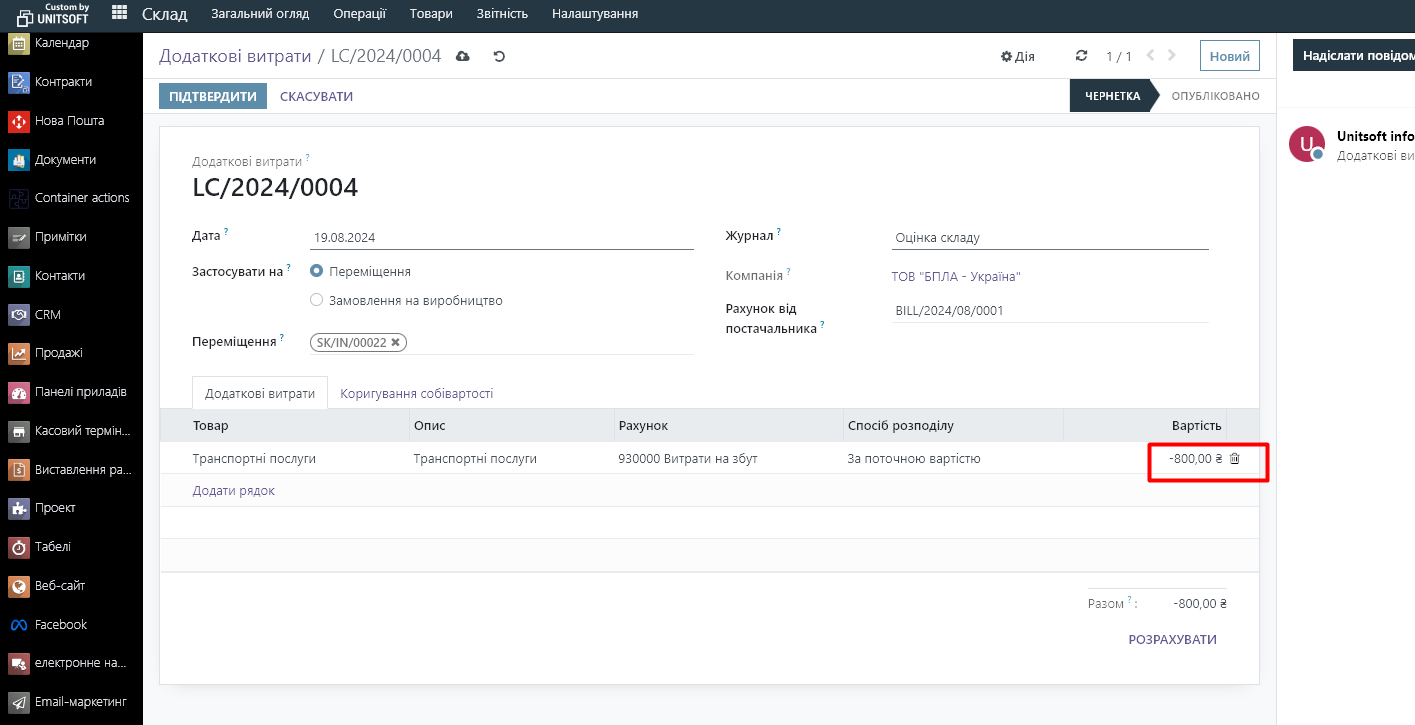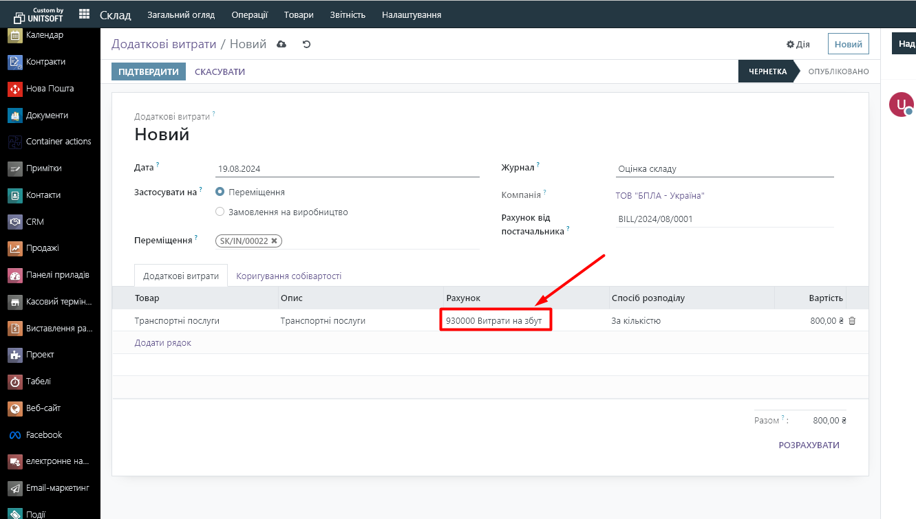 В системі Odoo це можна зробити за допомогою документу «Додаткові витрати».