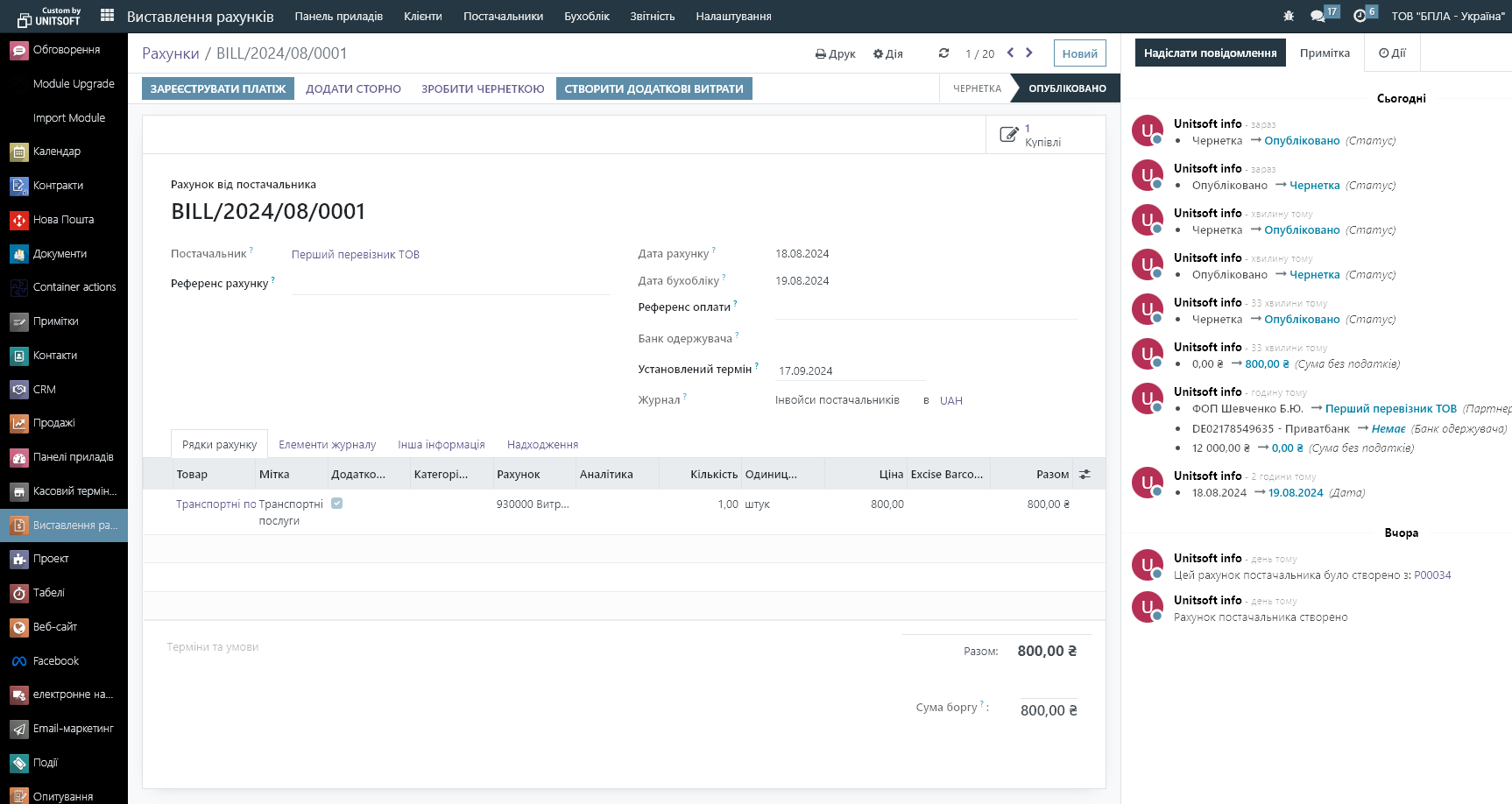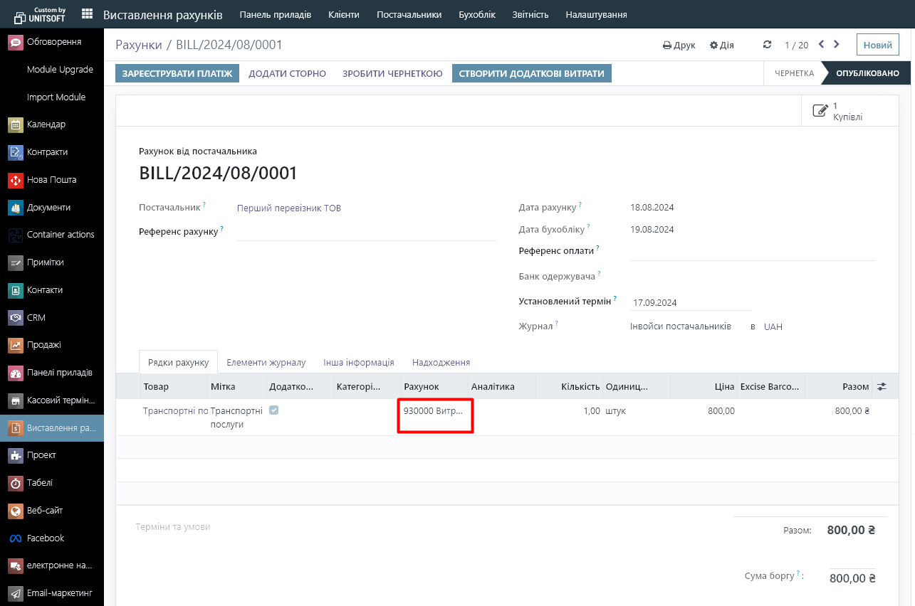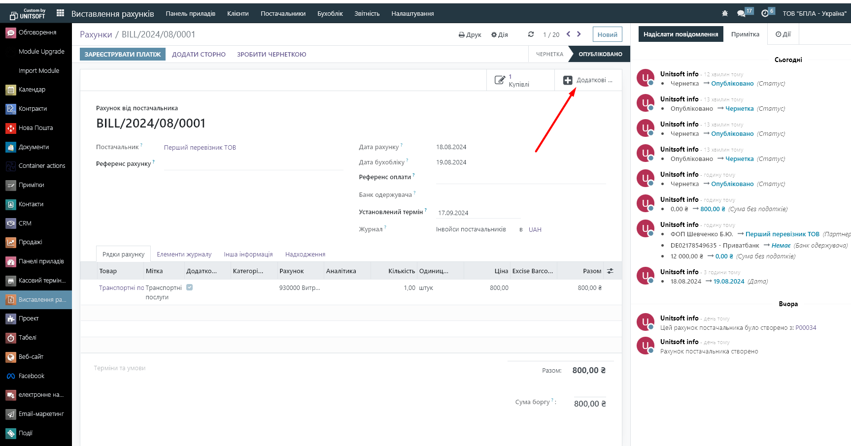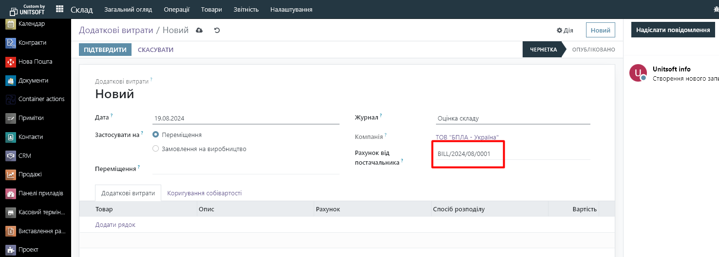 В системі Odoo це можна зробити за допомогою документу «Додаткові витрати».