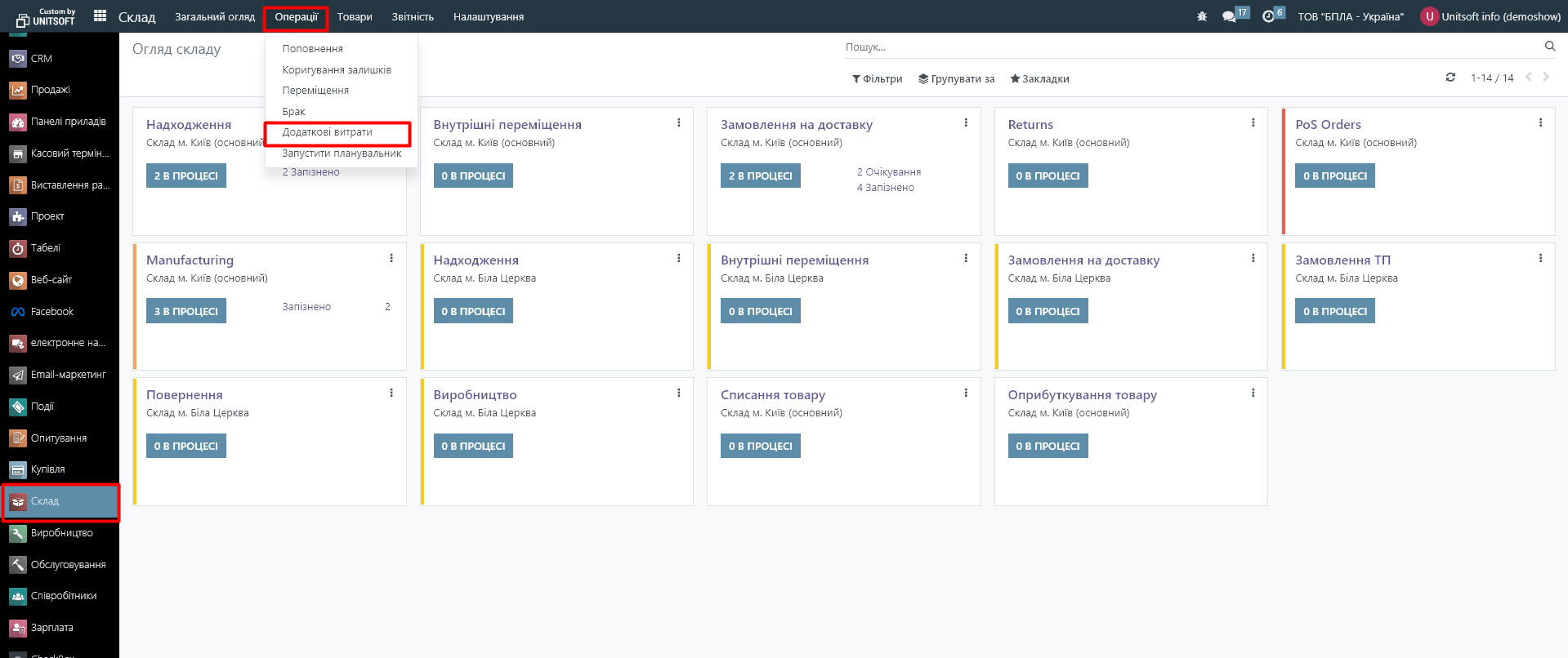 Другий – створити документ «Додаткові витрати» через модуль складу: