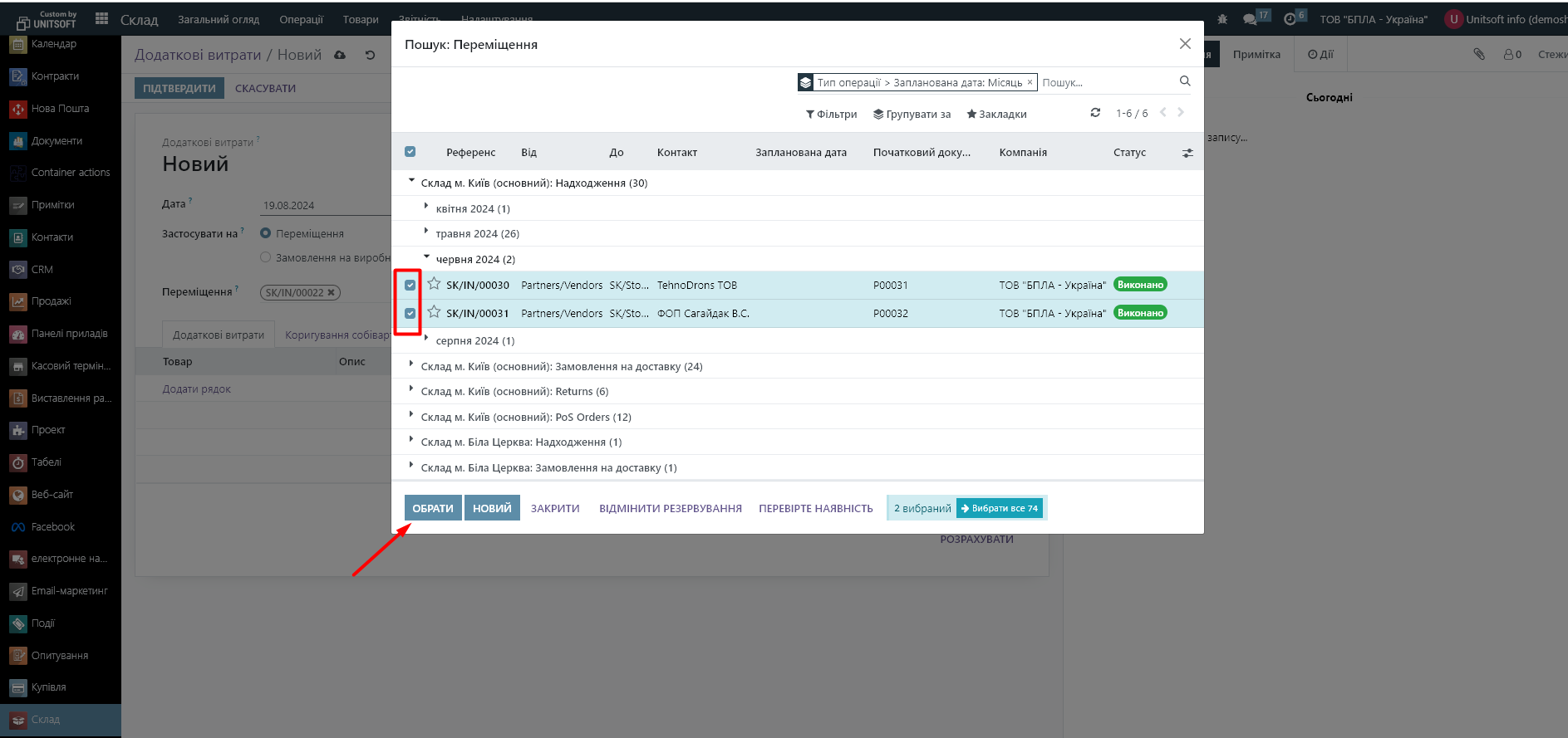 4.3.Вказуємо документ (складський ордер), по яким потрібно розподілити додаткові витрати: