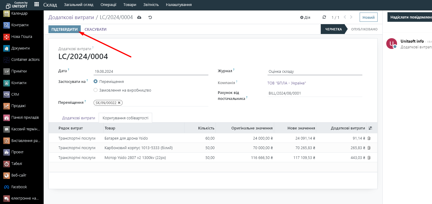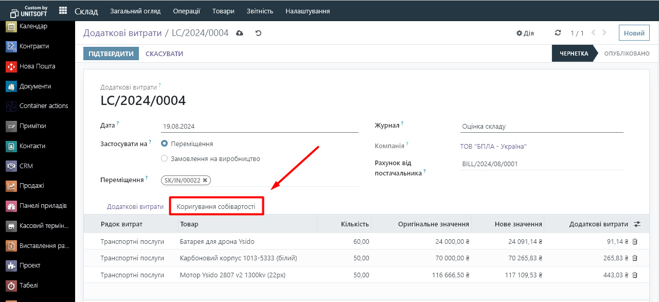 При необхідності зайві рядки можна видаляти, редагувати вручну значення «Додаткові витрати» (головне щоб сума всіх додаткових витрат дорівнювала значенню яке розподіляється, інакше система не дозволить підтвердити документ).