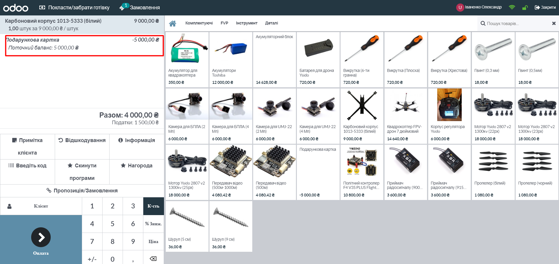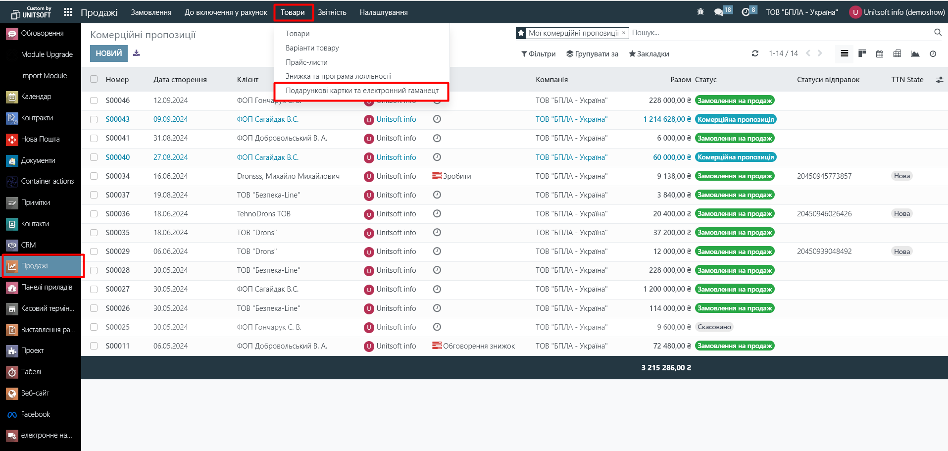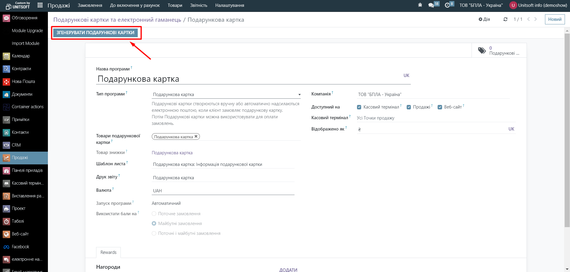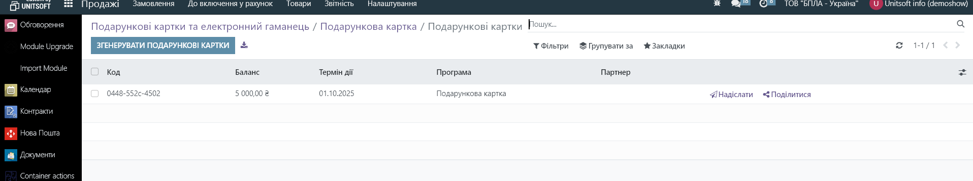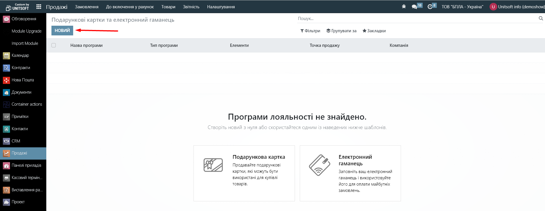 2.1   Зайдіть у модуль «Продажі» - «Товари» - «Подарункові картки та електронний гаманець».