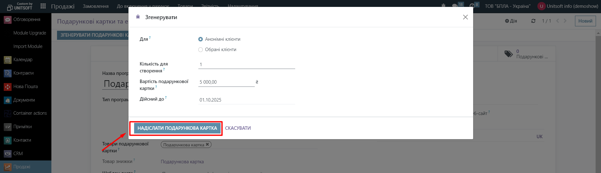 В новому вікні внесіть інформацію про номінал сертифікату та його термін придатності. Натисніть «Надіслати подарункову картку»:
