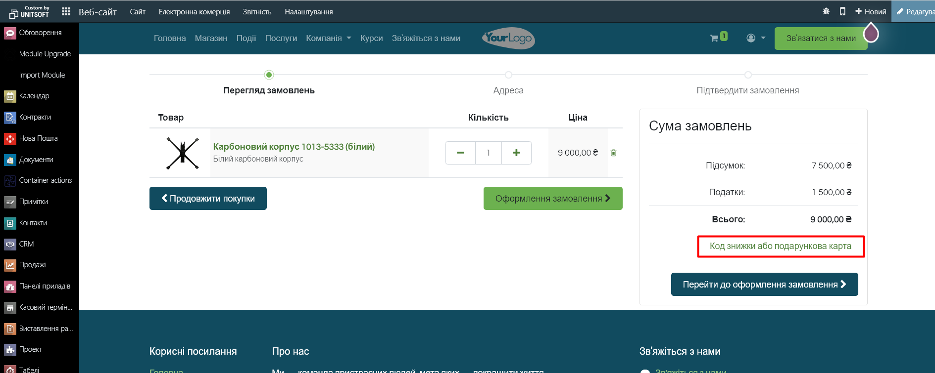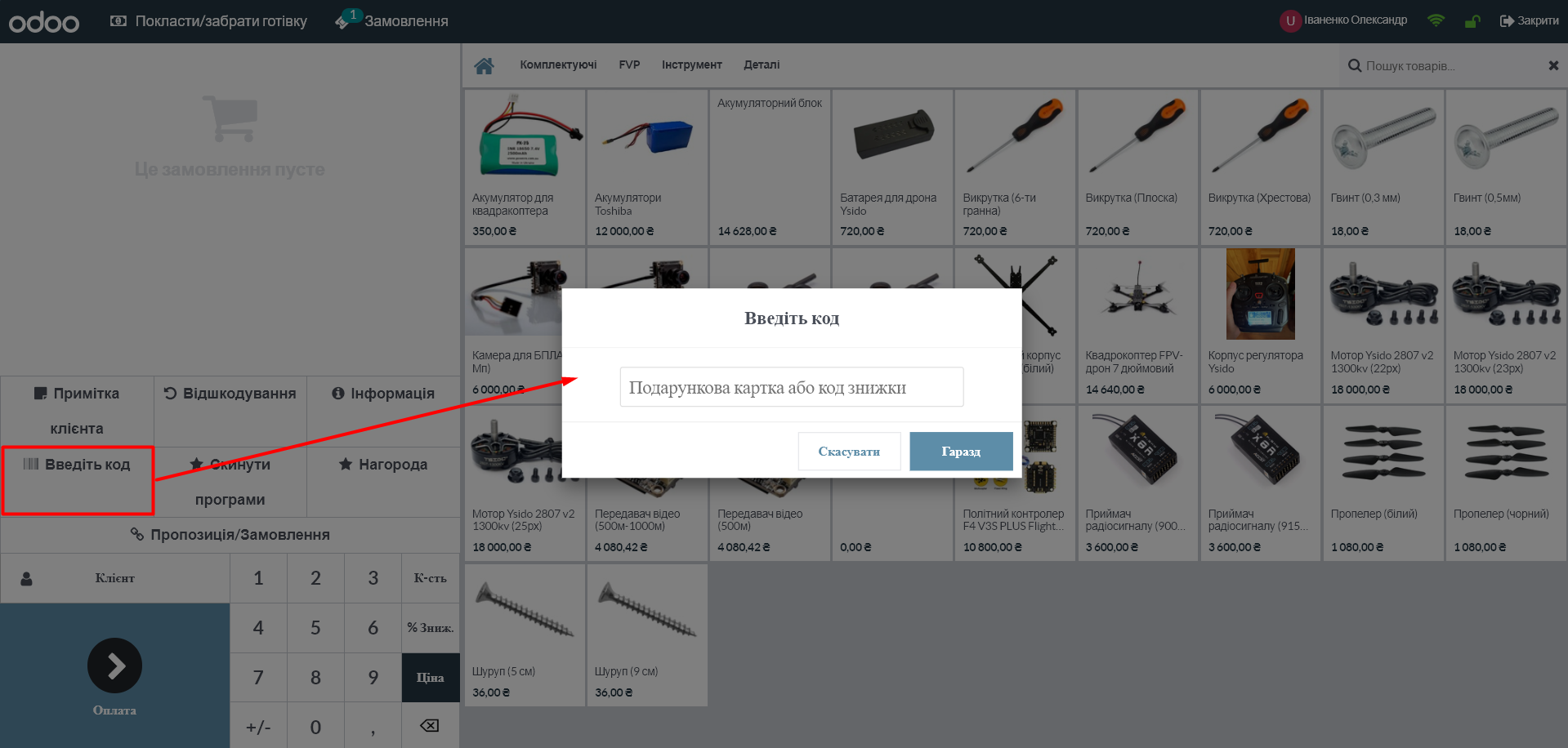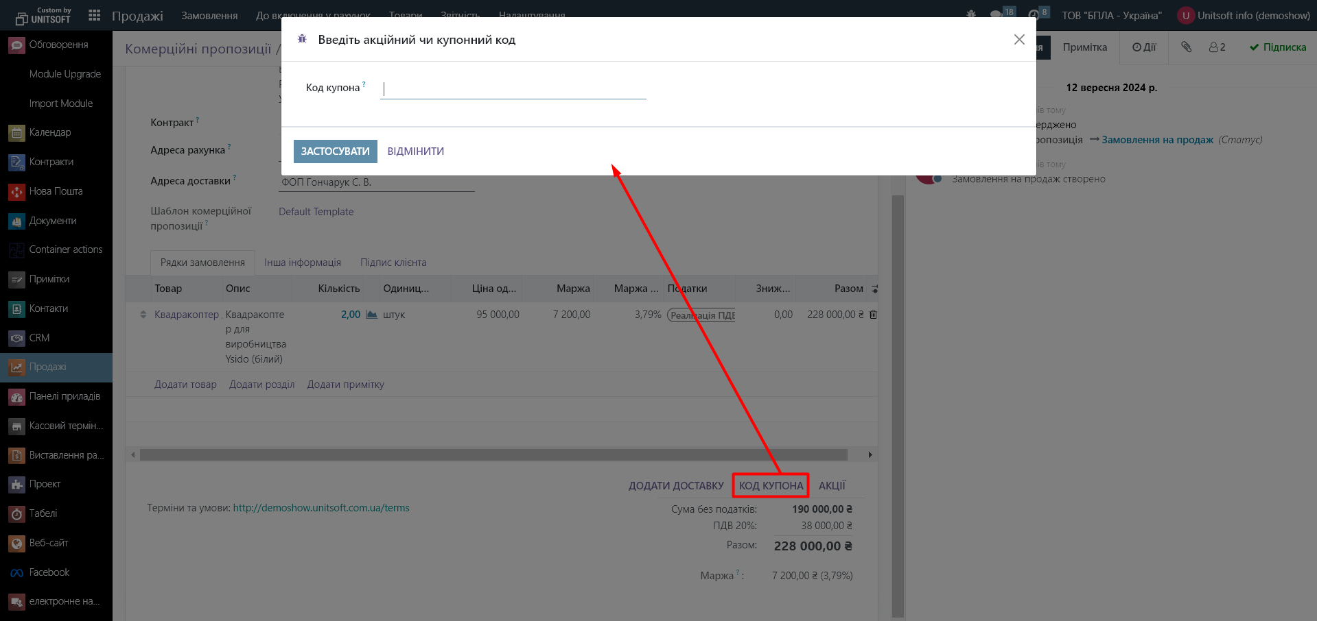 При оформленні замовлення через модуль «Продажі» натисніть кнопку «Код купона»: