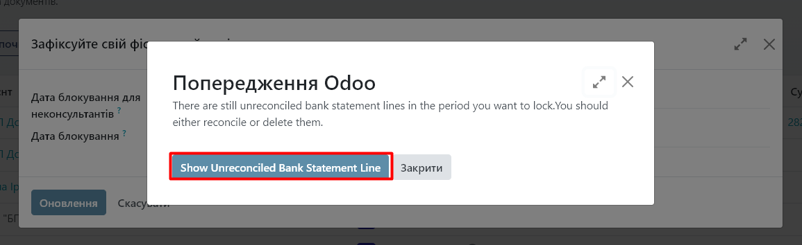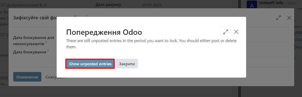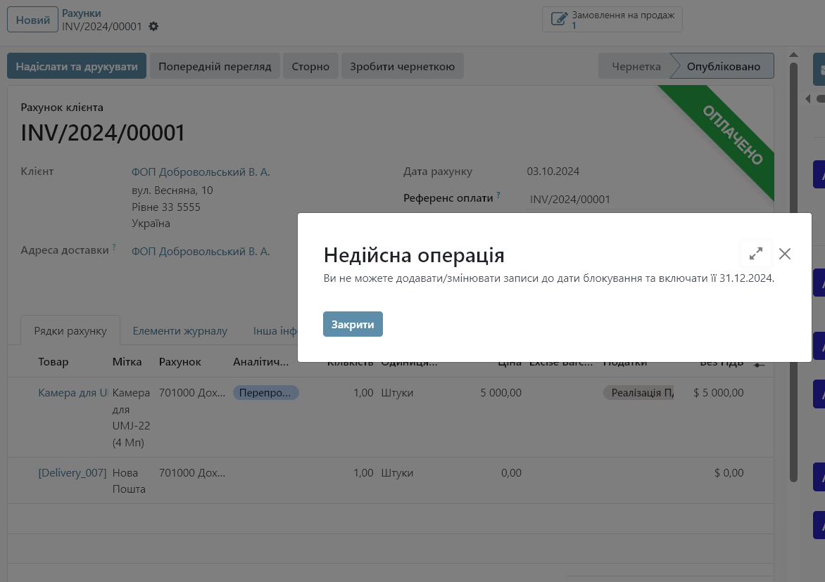 - Odoo не дозволить редагувати платежі, інвойси чи інші фінансові документи, дата яких входить у заблокований період.