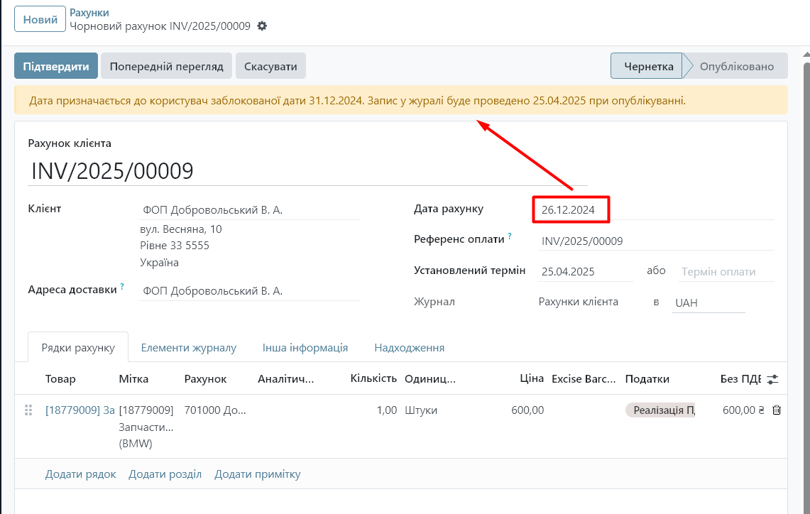 - Якщо ви намагатиметесь створити новий інвойс із датою з минулого періоду, система попередить, що бухгалтерські проводки будуть зроблені на поточну дату, а не на вказану.