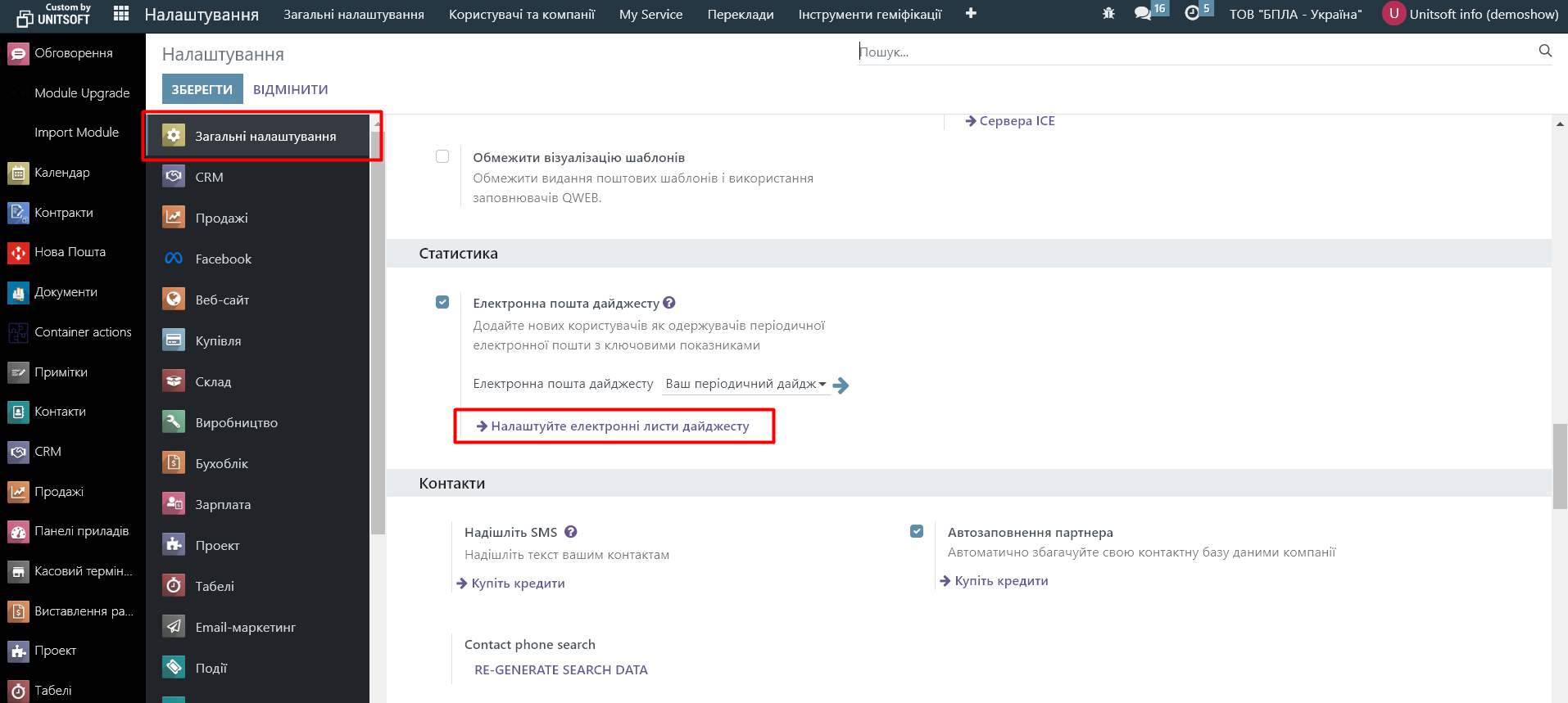 Окремо Ви можете налаштувати отримувачів розсилки дайджесту та його періодичність. Для цього потрібно перейти в модуль «Налаштування» - розділ «Загальні налаштування»: