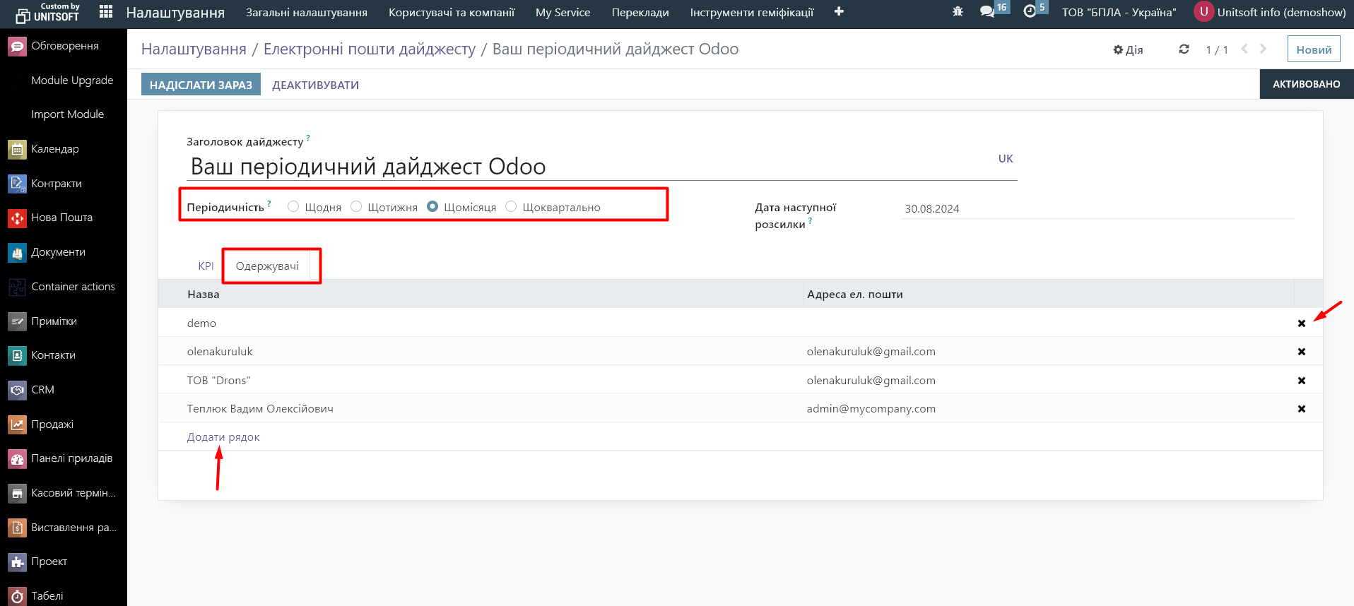 Серед переліку дайджестів обираємо той, що нас цікавить і налаштовуємо в ньому періодичність та список отримувачів:
