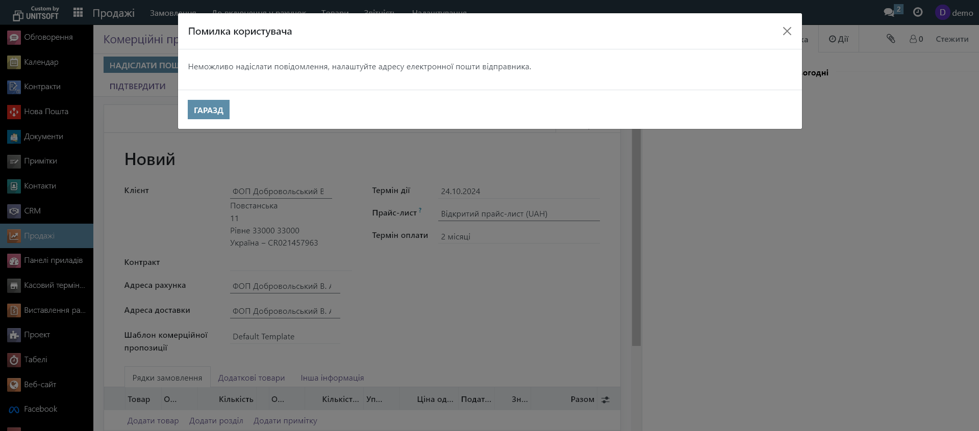 Як виправити помилку «Неможливо надіслати повідомлення, налаштуйте адресу електронної пошти відправника» при підтвердженні комерційної пропозиції?
