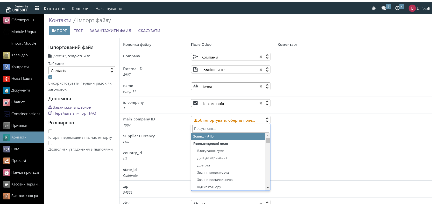 полів в Excel файлі та Odoo. Якщо Ви використовували готовий шаблон, то ці поля