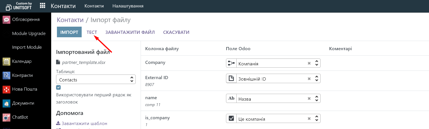 У отриманому вікні Ви можете завантажити готовий шаблон Excel файлу для імпорту партнерів в Odoo :