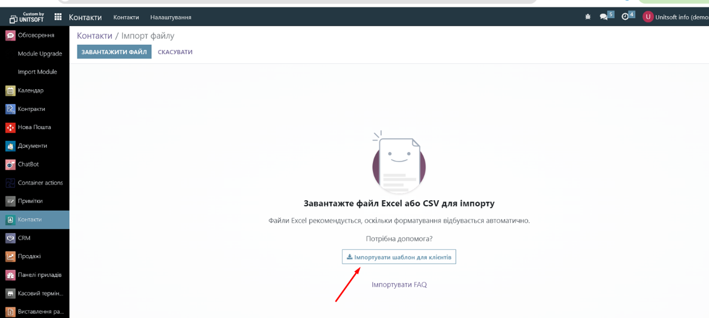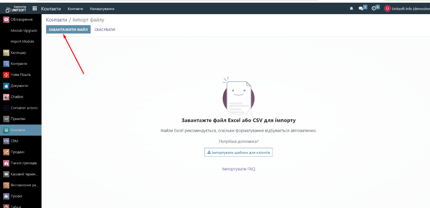 Для завантаження бази партнерів (контрагентів), Вам необхідно перейти в модуль "Контакти". Натиснути на кнопку "Закладки" - "Імпортувати записи":