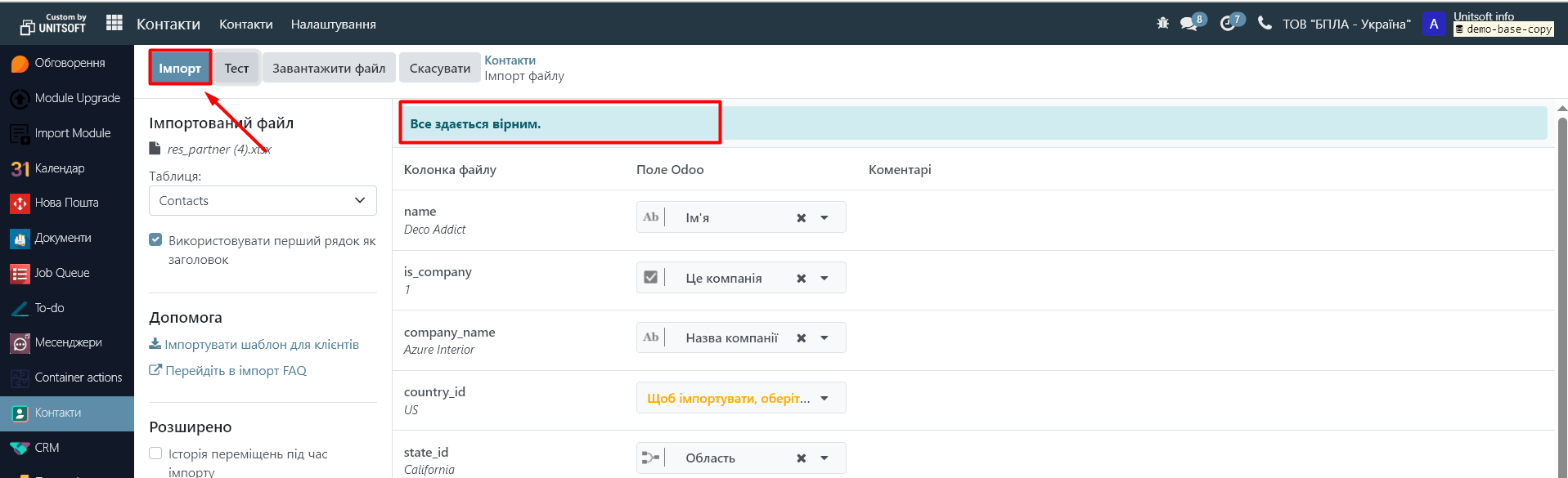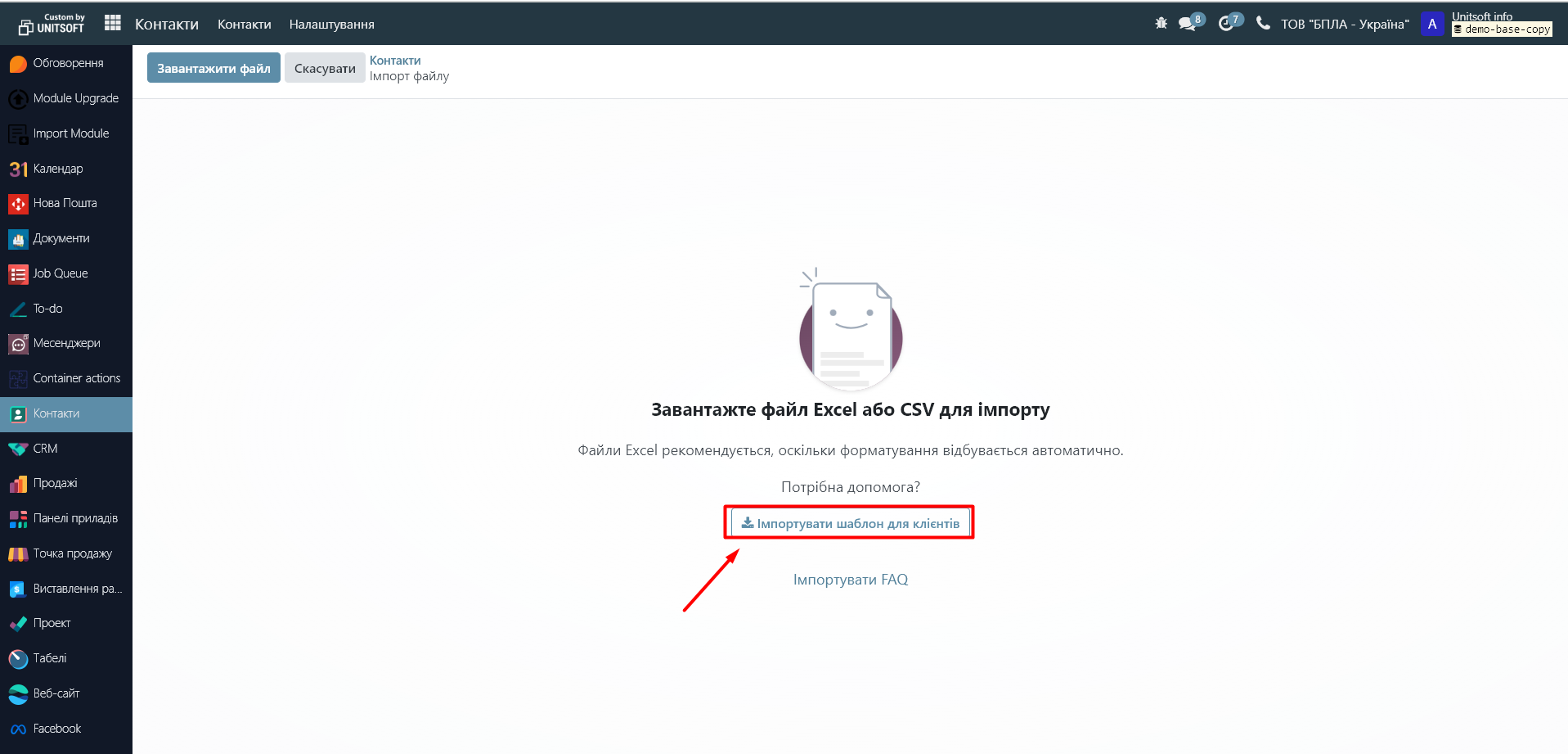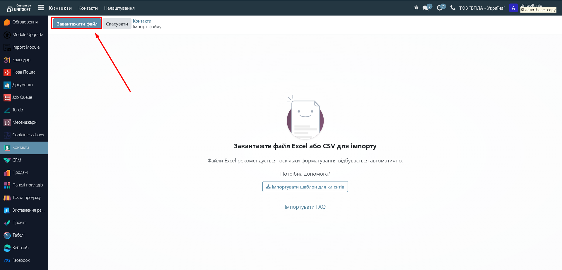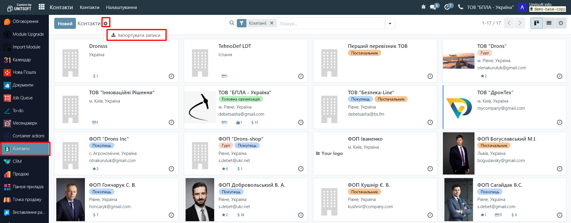 Для завантаження бази партнерів (контрагентів), необхідно перейти в модуль "Контакти". Натиснути на кнопку "Дія" - "Імпортувати записи»: