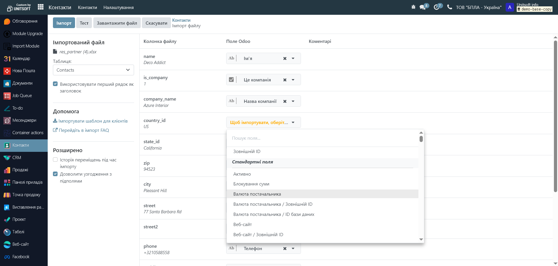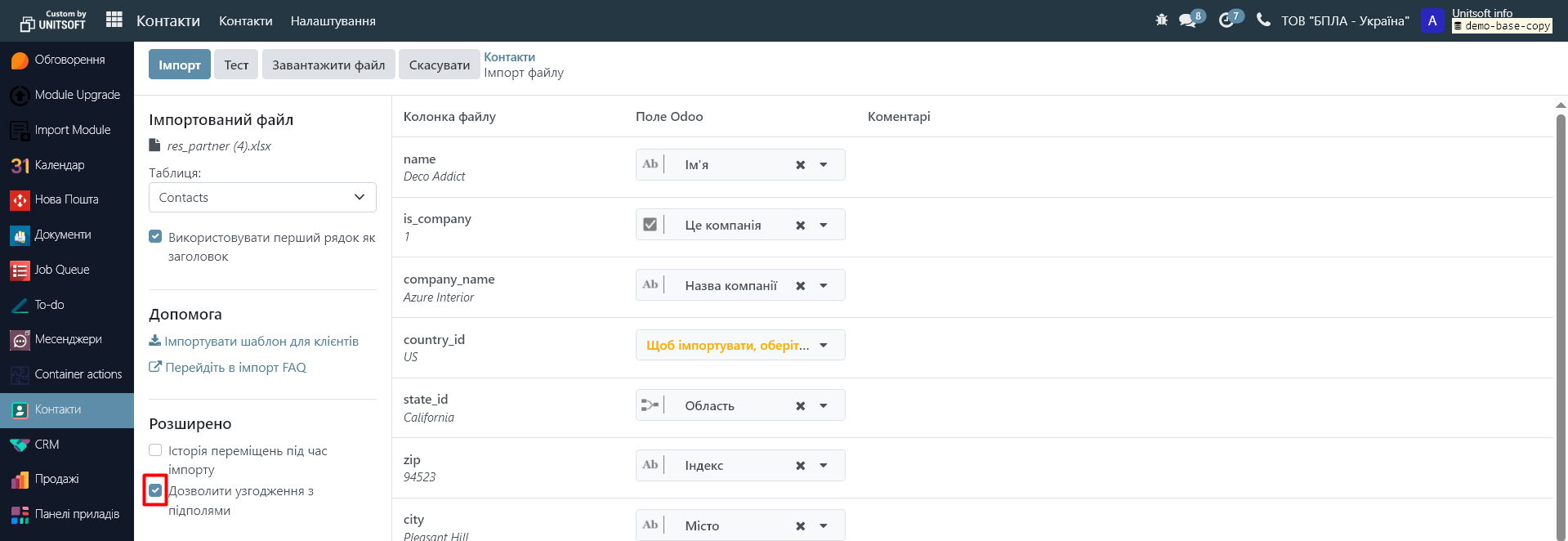 У правій панелі проводиться співставлення колонок в Excel файлі та полів Odoo. Якщо Ви використовували готовий шаблон, то ці поля проставляться автоматично, якщо ні - їх потрібно буде налаштувати вручну: