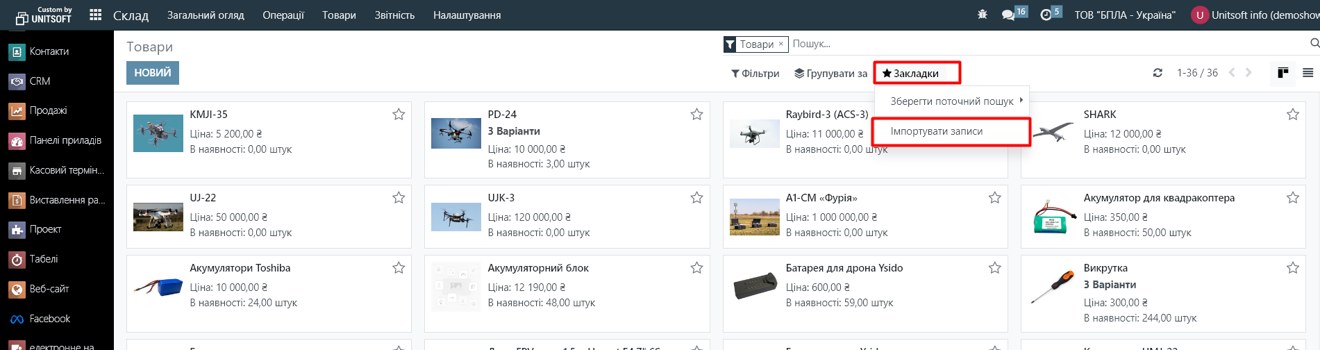 Далі в довіднику товарів потрібно натиснути на кнопку "Закладки" - "Імпортувати записи":