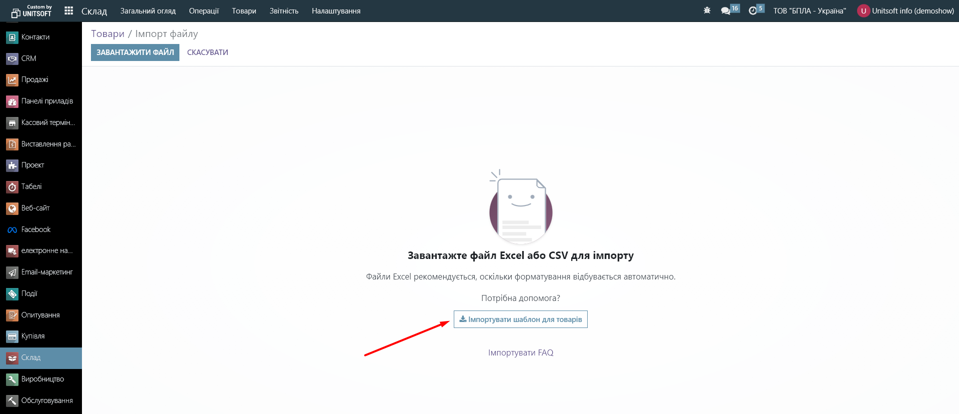 У отриманому вікні Ви можете завантажити готовий шаблон Excel файлу для імпорту товарів в Odoo :
