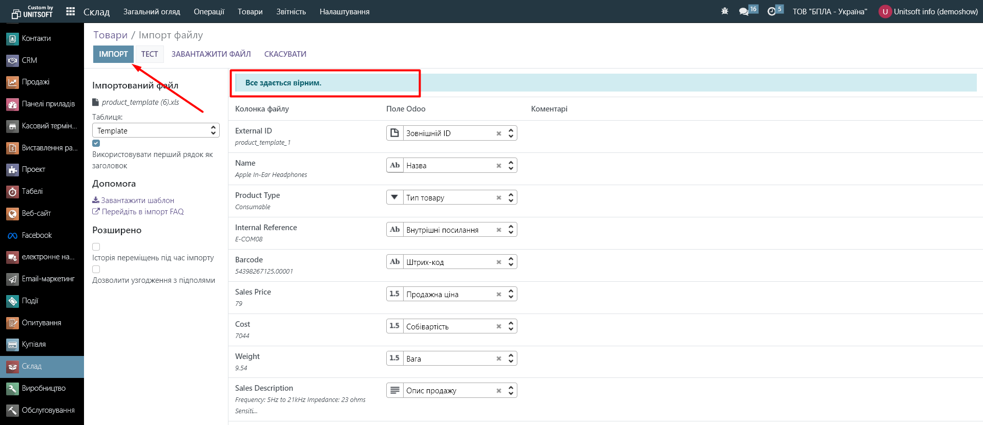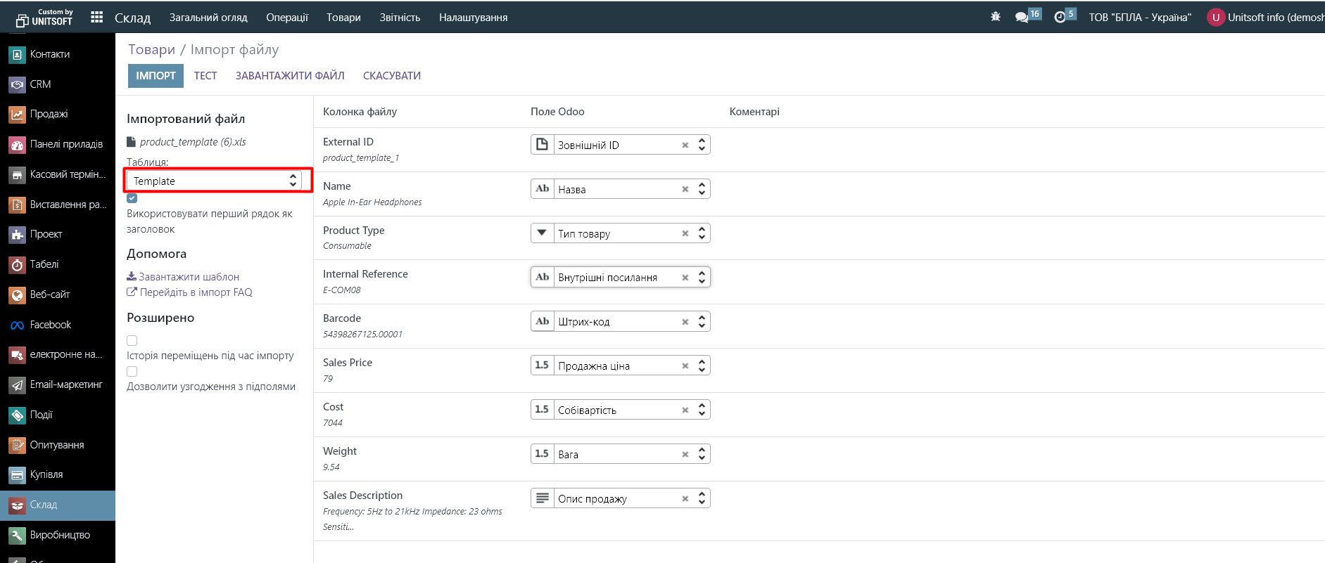 У Вас відкриється вікно, в якому відбувається співставлення полів в Excel файлі та в Odoo. Якщо Ви використовували готовий шаблон, то ці поля проставляться автоматично, якщо ні - їх потрібно буде налаштувати вручну: