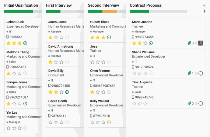 Візуалізуйте свій конвеєр рекрутингу за допомогою канбан-візуалізації та налаштовуйте кожен етап процесу, наприклад, попередню кваліфікацію, першу співбесіду, другу співбесіду та переговори. Отримуйте точну статистику по вашому конвеєру рекрутингу, щоб відстежувати прогрес.