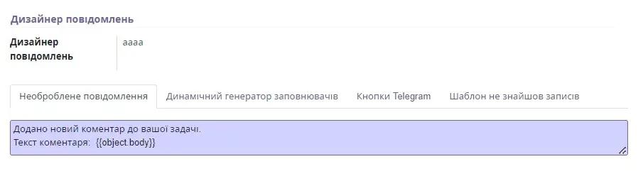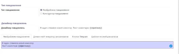 In field "Unprocessed message" enter the text of our message to the user. If you need to add a field to the text, the placeholder expression can be obtained on the tab "Dynamic placeholder generator".