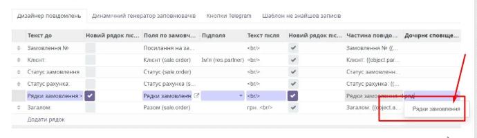 In the message designer tab, press the button "Add" line and in turn, according to our starting template, we add all the necessary fields from the Order model:
