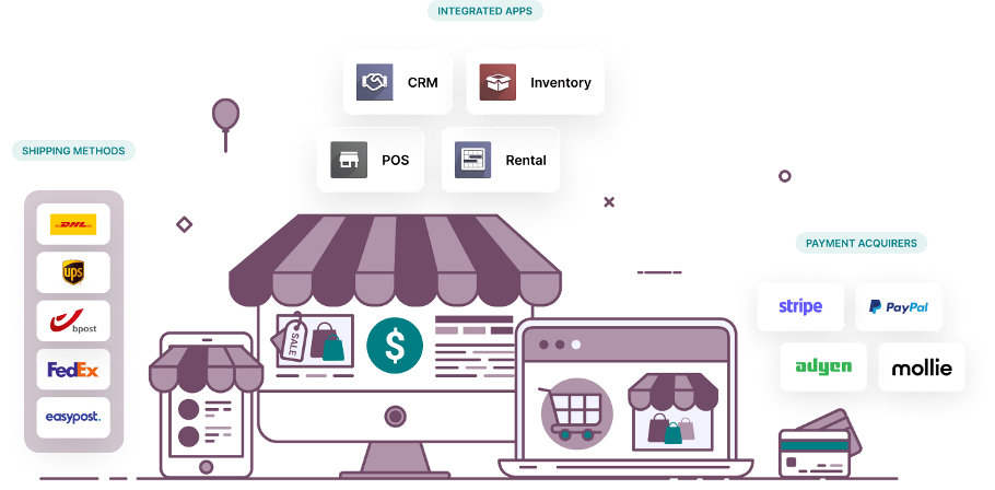 За допомогою різних додатків Odoo ви можете інтегрувати свій інтернет-магазин з іншими каналами продажів, включаючи з вашими точками продажу (POS) та системами управління взаємовідносинами з клієнтами (CRM),